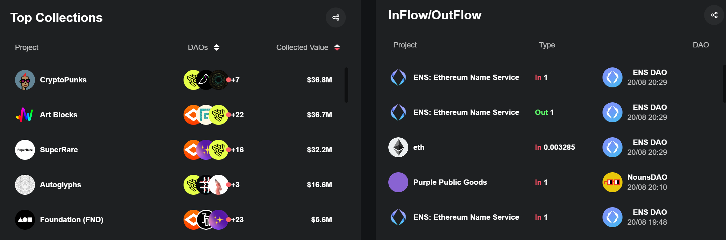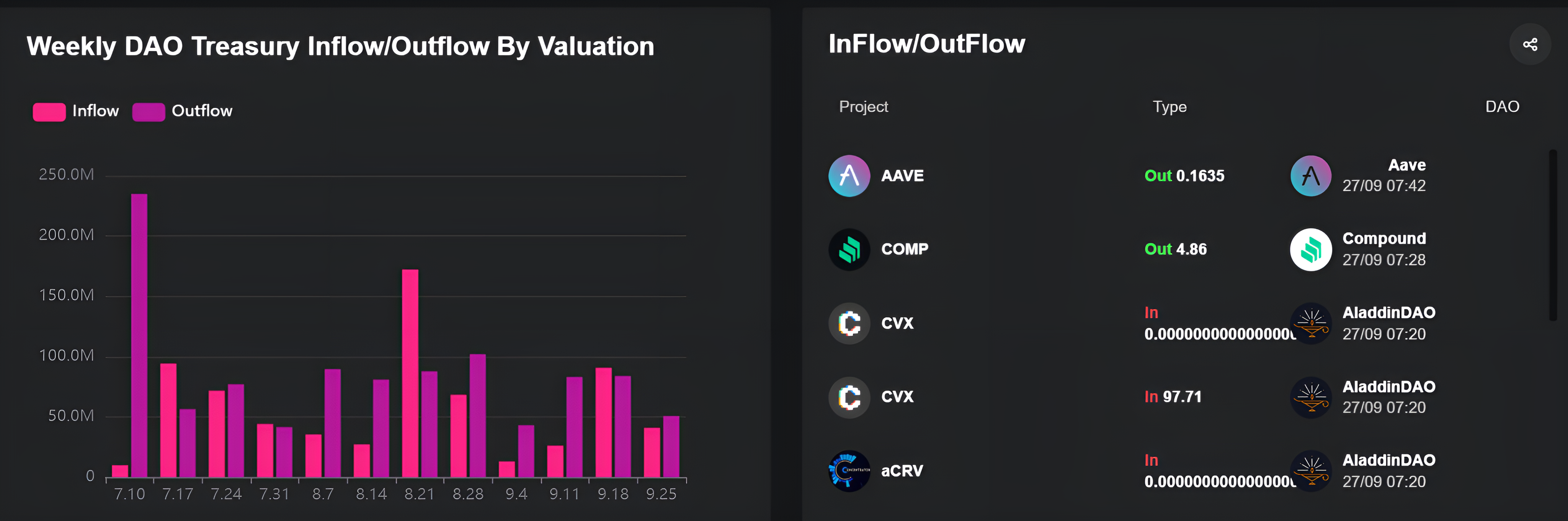 跟踪 DAO 资金库中数字资产的每周流动情况，基于实时市场估值计算。该板块帮助你了解 DAO 是在持续积累资金还是进行资本支出，以及资金的具体形式。