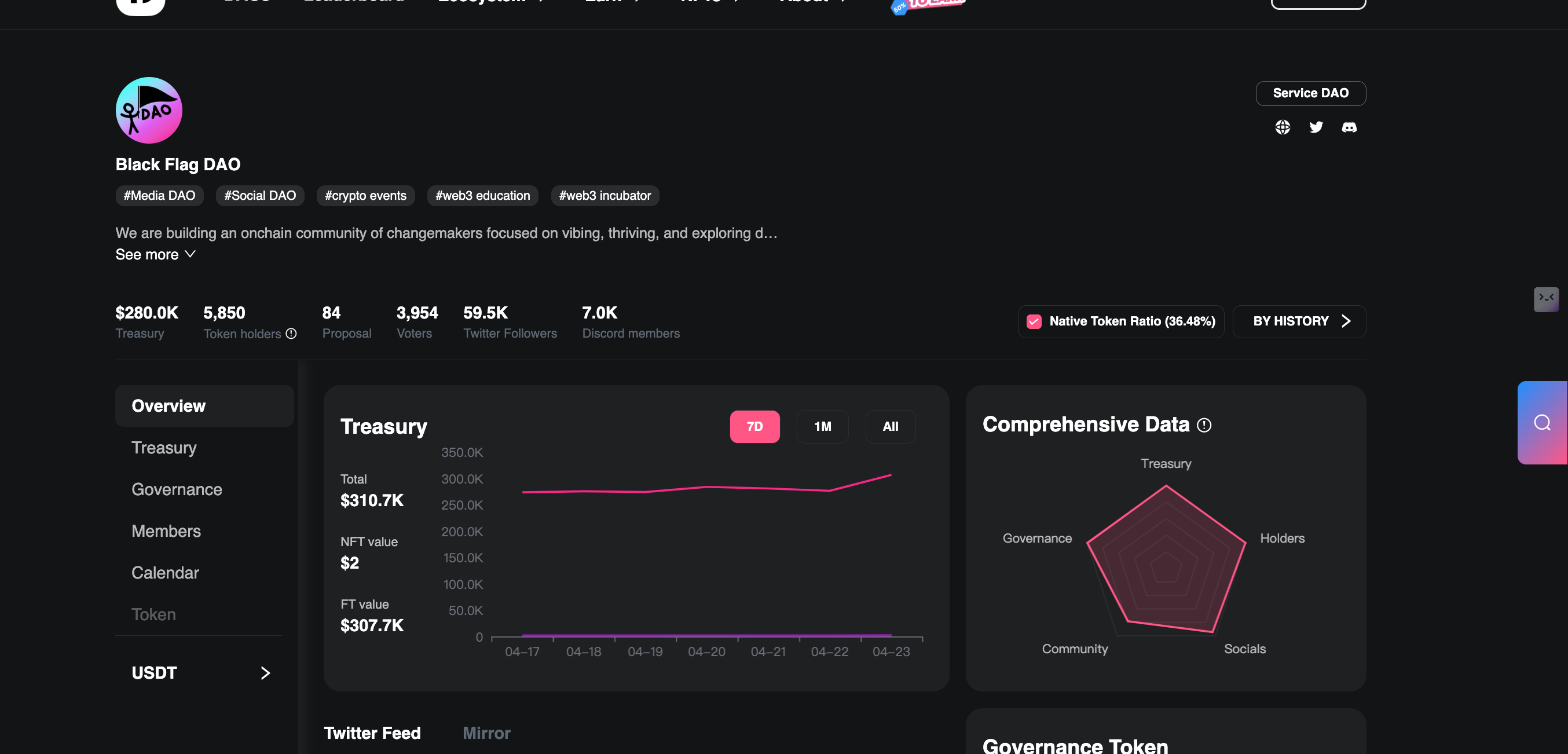 * 关键统计数据：金库总值、持币人数、提案数量、投票人数、Twitter 关注数、Discord 成员数