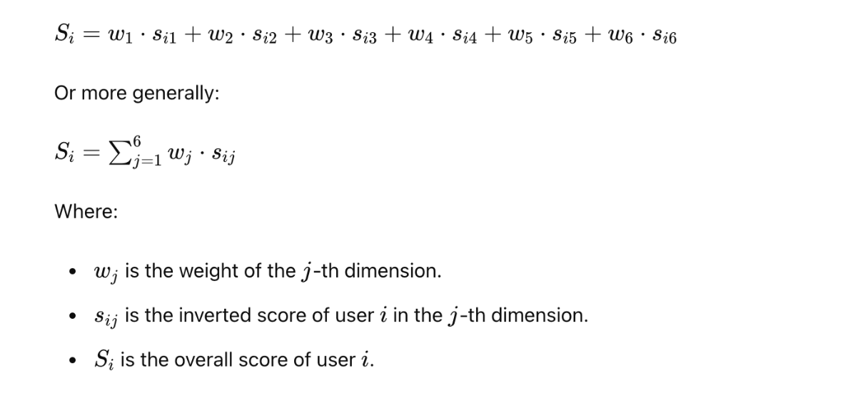 最后,我们得到六个维度的权重(权重会随着用户数据的变化而动态调整):