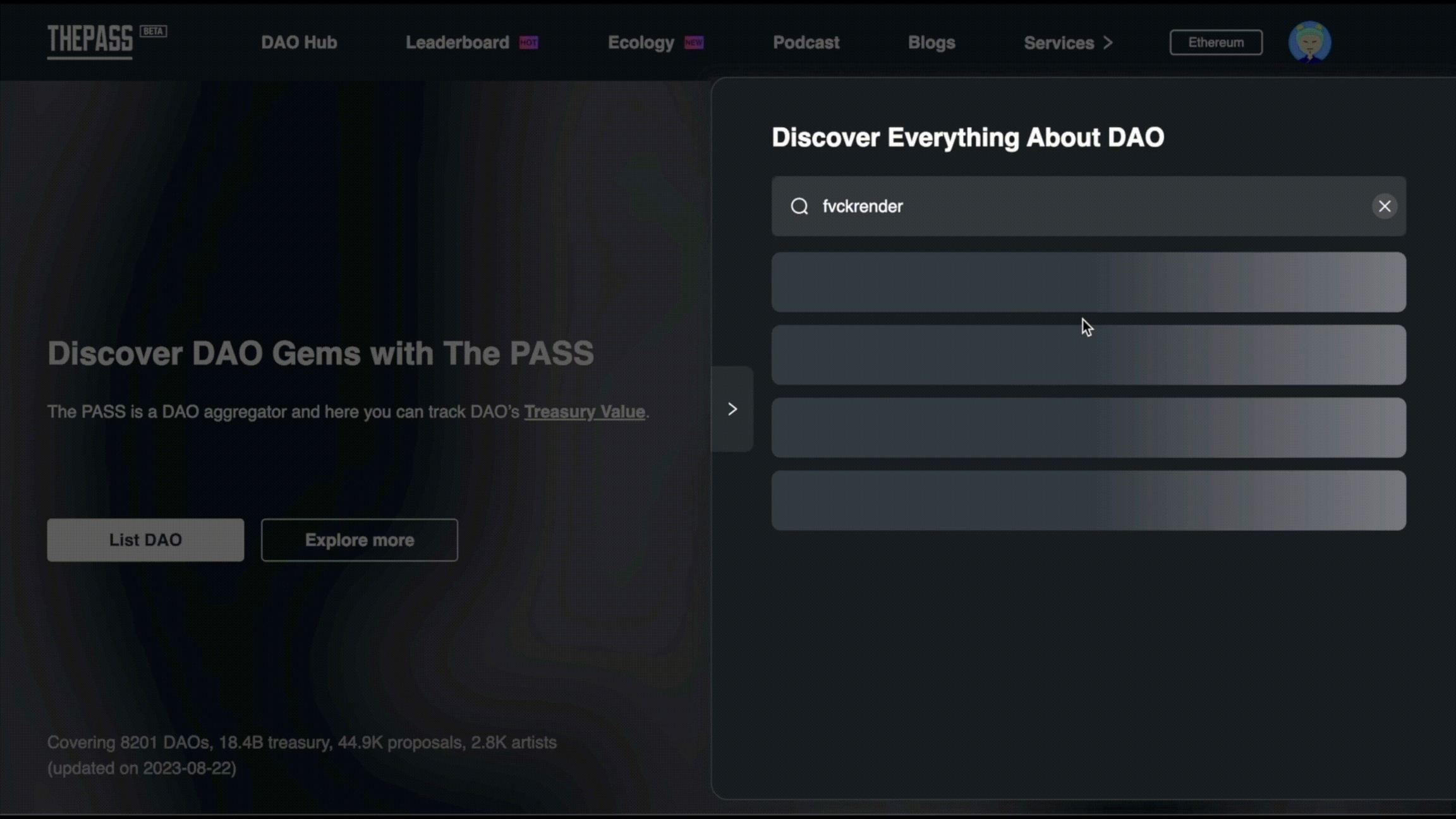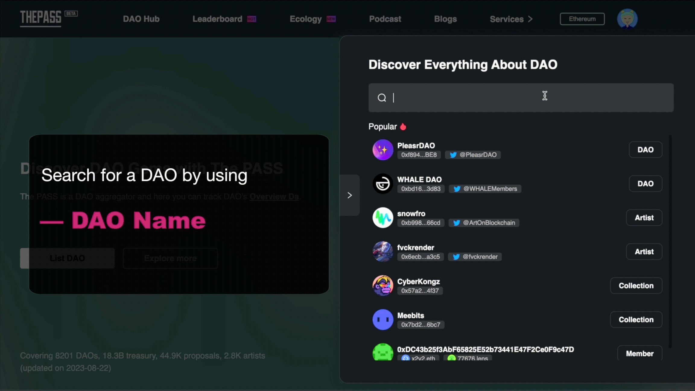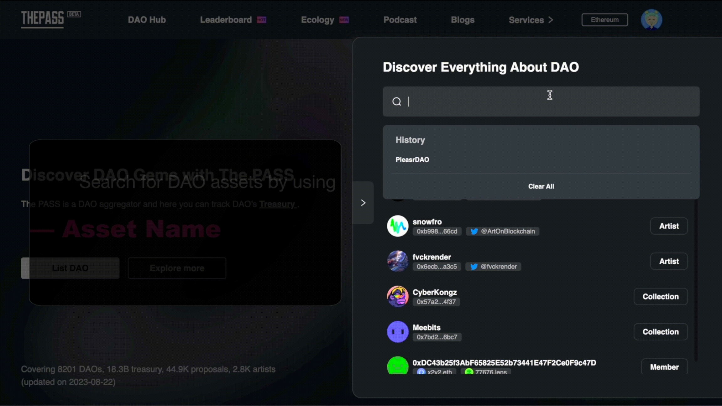 Supports searches based on DAO names, DAO Twitter handles, treasury addresses, and treasury addresses’ ENS/lens.