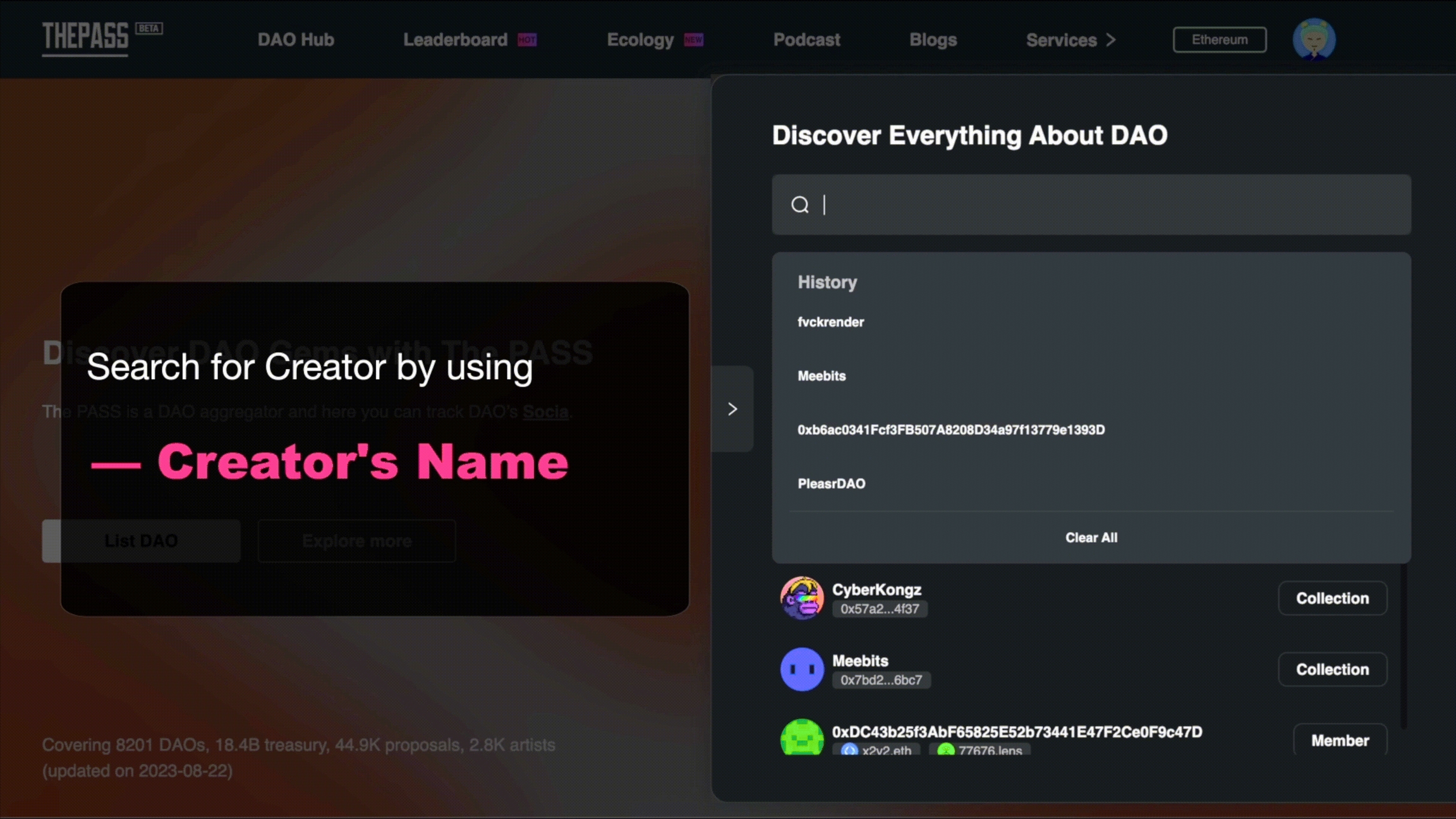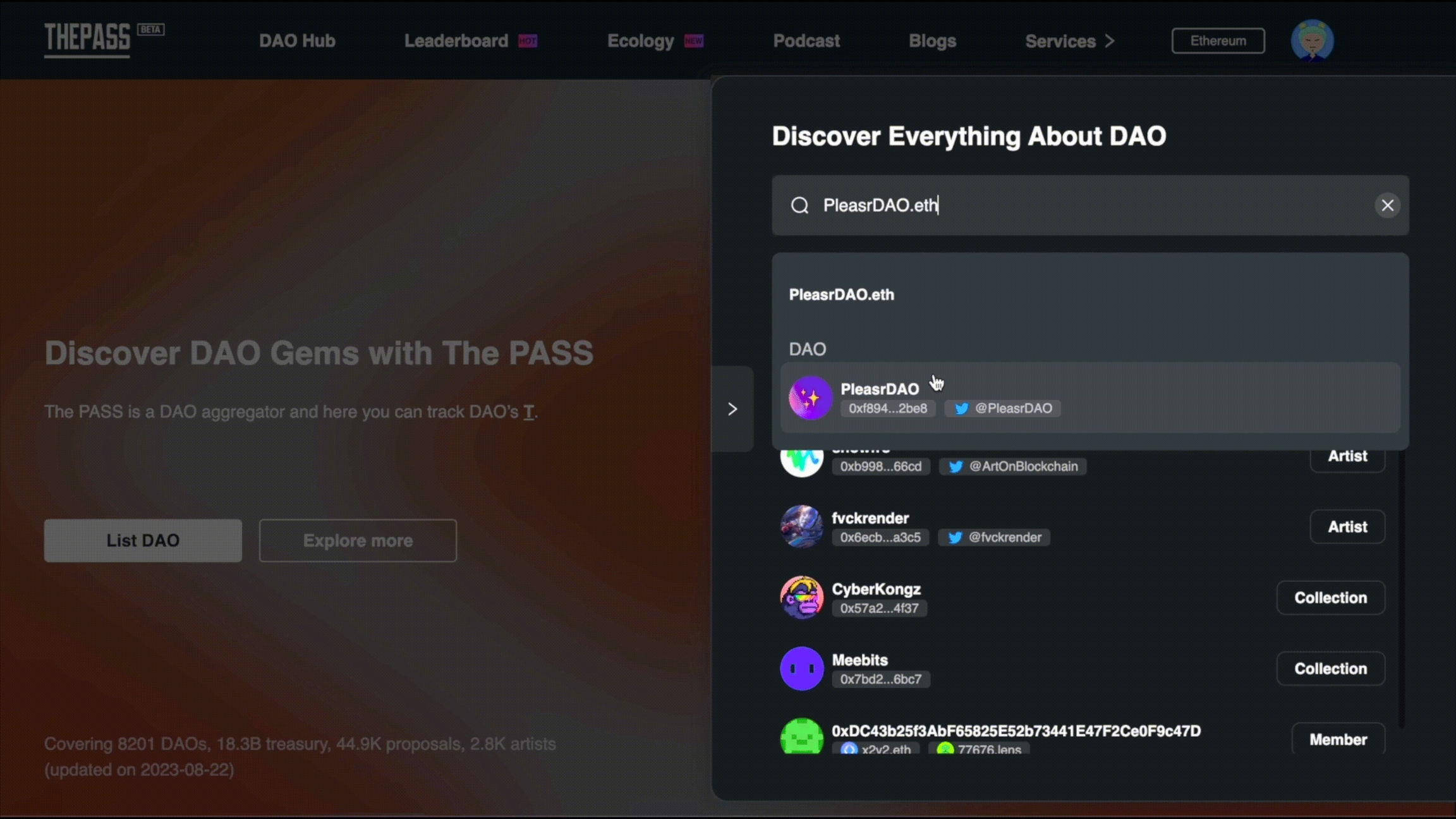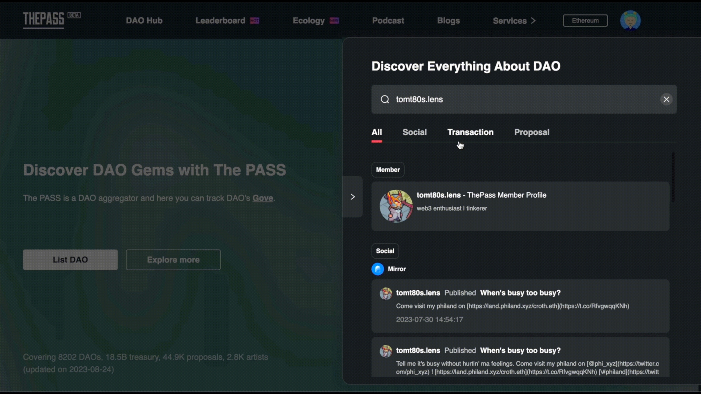 Supports searches based on DAO names, DAO Twitter handles, treasury addresses, and treasury addresses’ ENS/lens.
