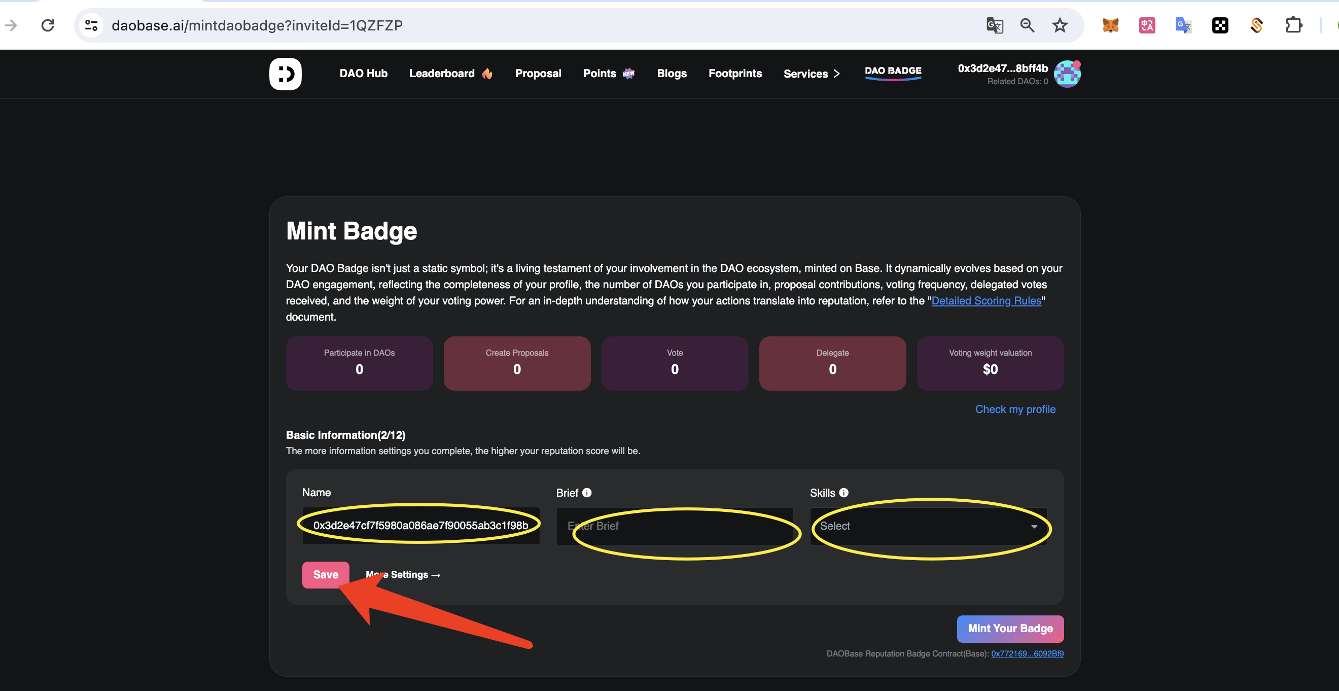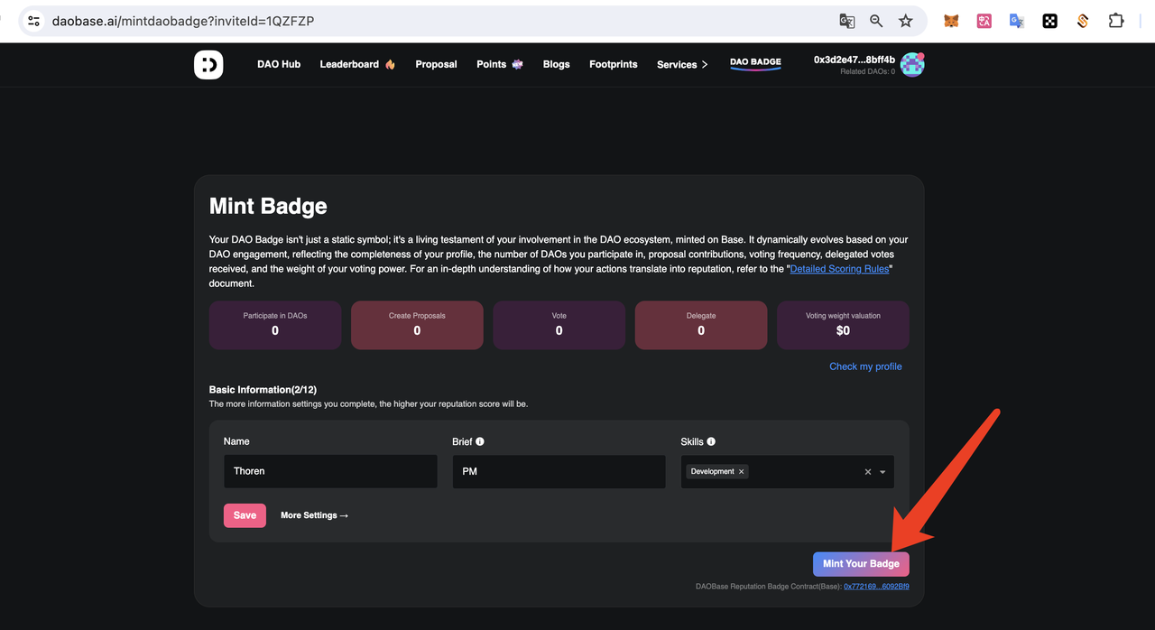 **1.배지 페이지(<https://daobase.ai/mintdaobadge?inviteId=1QZFZP)에> 접속하여 지갑 연결을 완료하세요.**