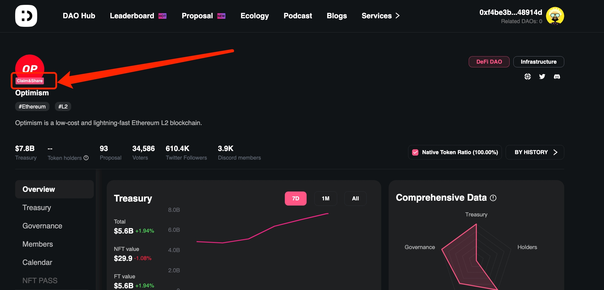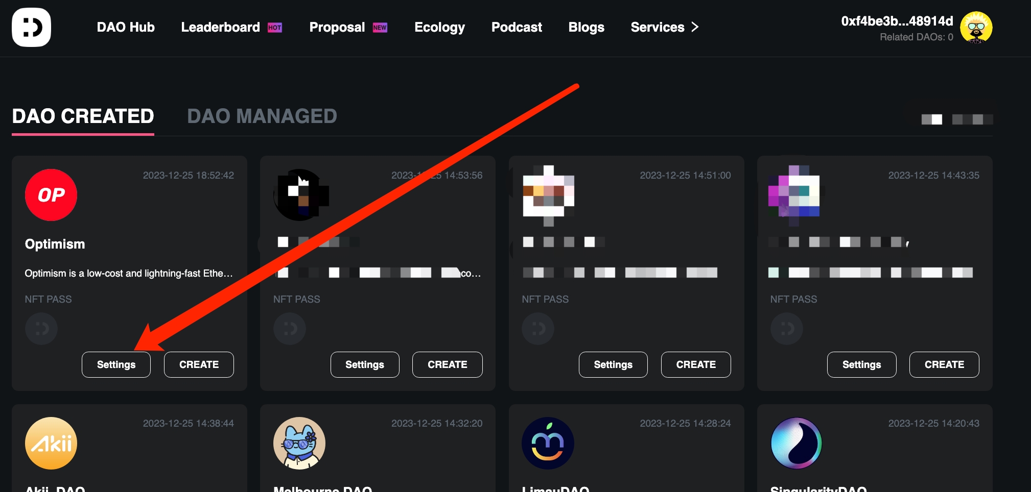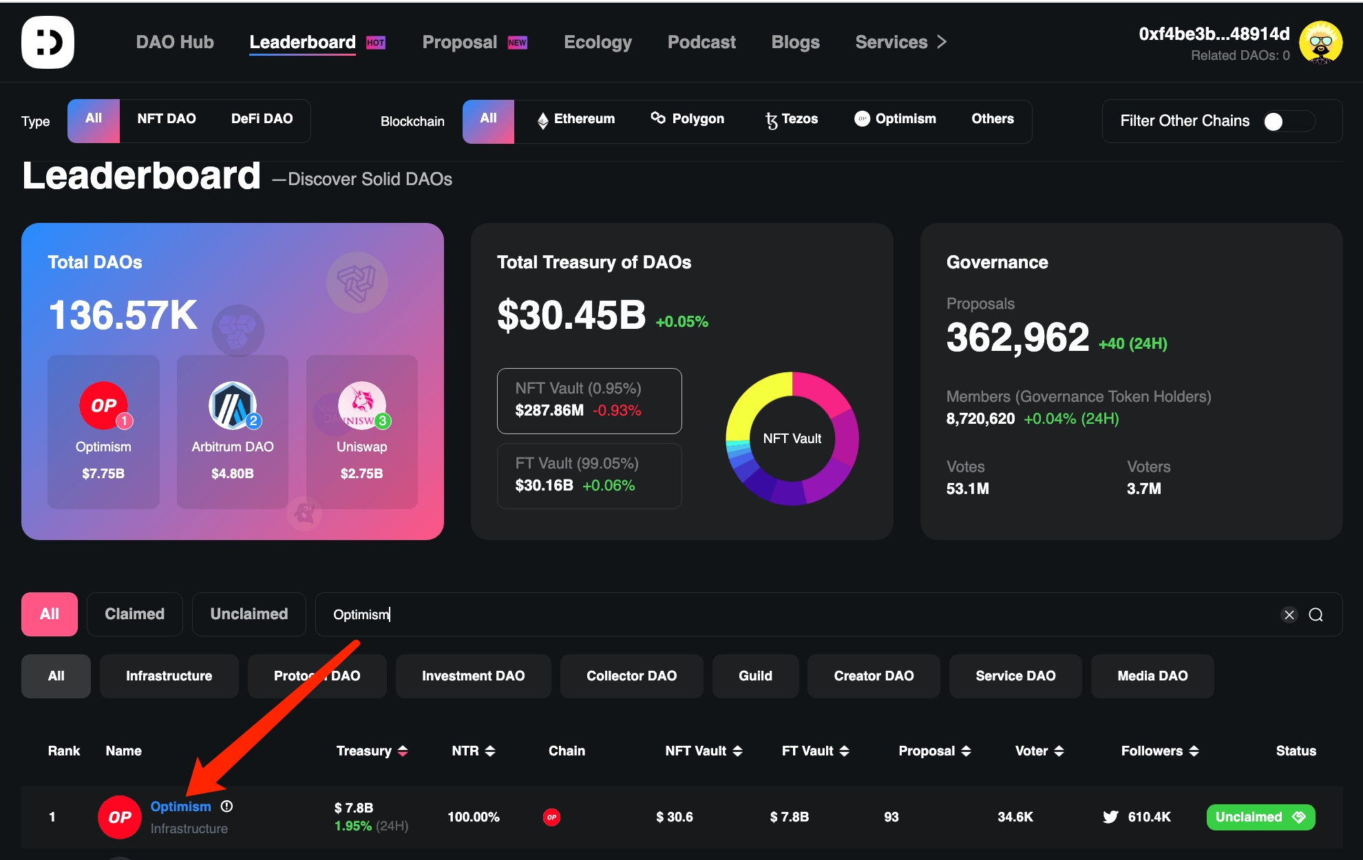 1.DAO 검색 및 홈 진입 리더보드 모듈에서 자신이 운영 중인 DAO 이름을 검색하여 해당 DAO를 찾습니다.