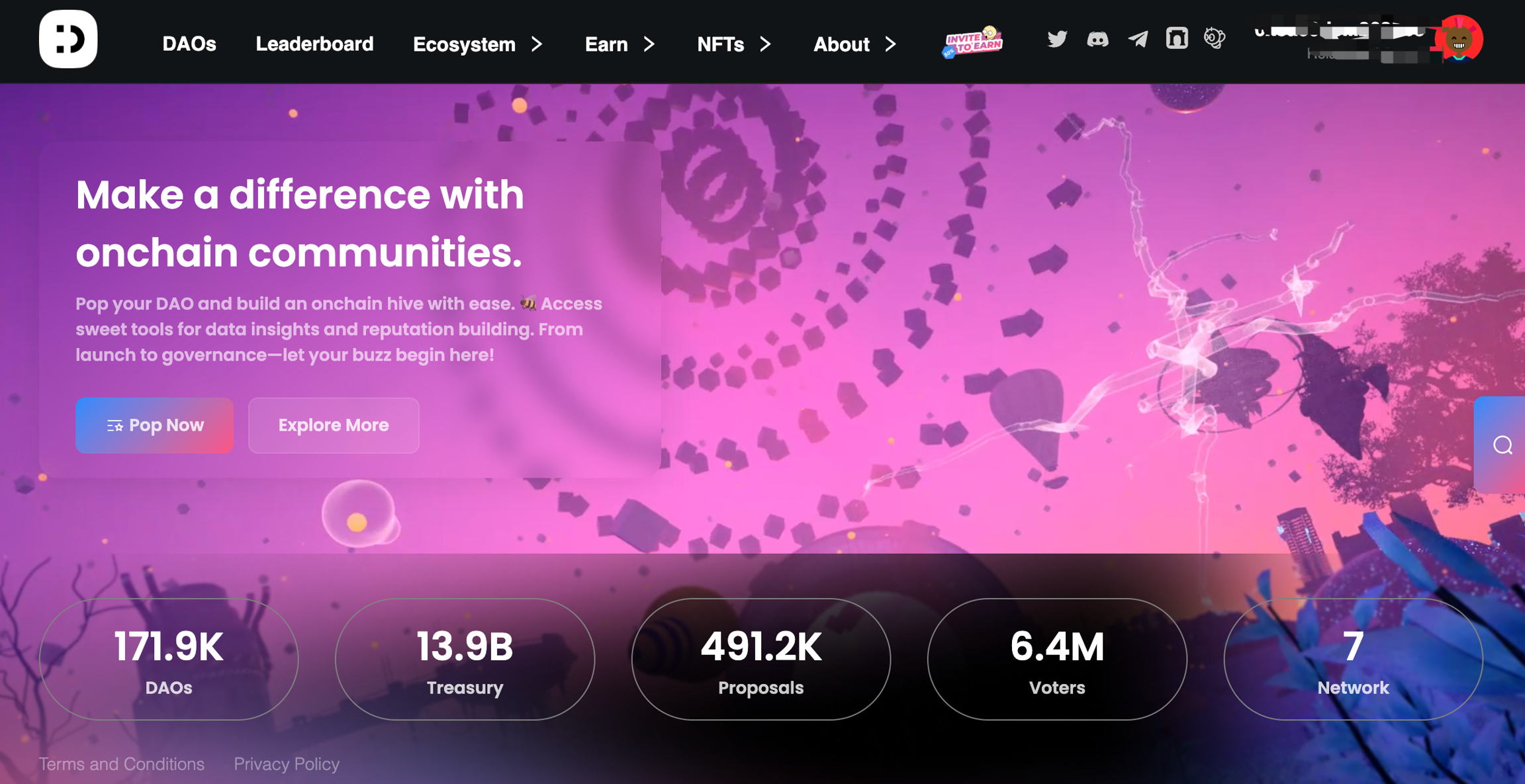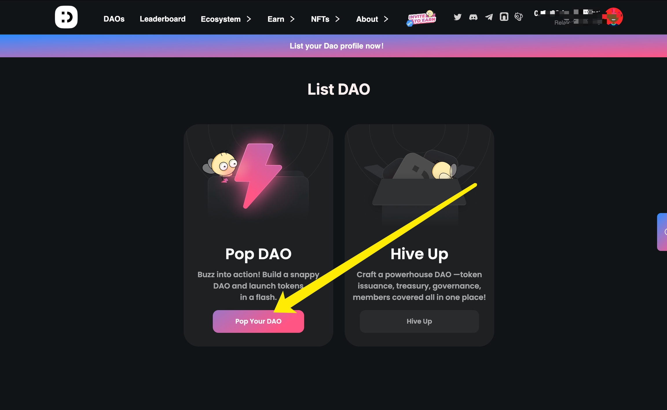 1.DAOBase 홈페이지에 접속하여 지갑을 연결한 후, 상단의 ‘Pop Now’ 버튼을 클릭하면 DAO 설정 화면으로 이동합니다.