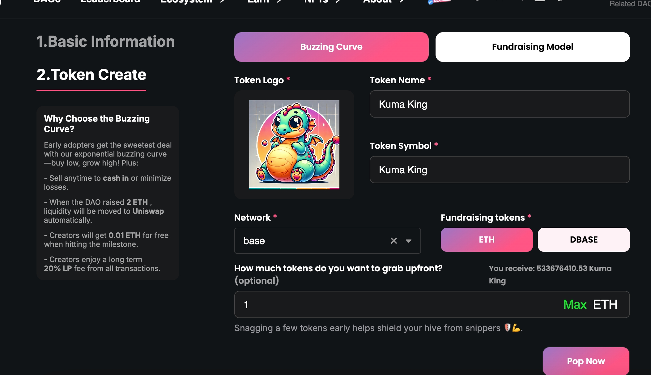 Buzzing Curve 모델: 토큰 로고, 이름, 심볼 등 필수 정보를 입력하고, 펀딩 토큰 및 초기 구매 금액을 설정합니다. 이후 ‘Pop Now’ 버튼을 클릭하여 다음 단계로 진행합니다.