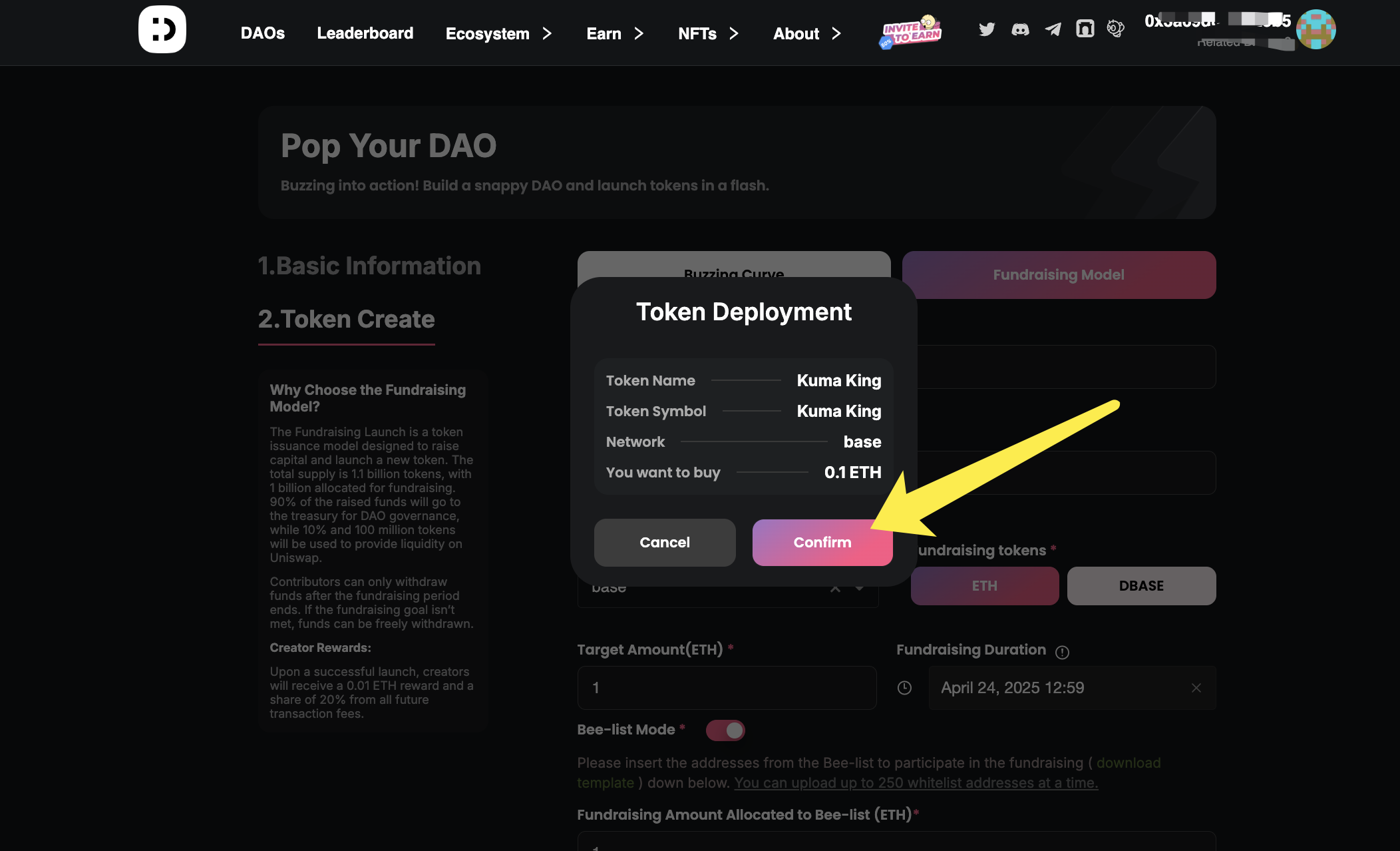 Fundraising 모델: 토큰의 로고, 이름, 심볼 등을 입력한 후, 펀딩 토큰과 목표 금액을 설정합니다. 필요 시 Whitelist 모드를 활성화하여 화이트리스트 주소, 할당 한도, 조기 구매 금액 등을 구성할 수 있습니다. 설정 후 **‘Pop Now’**를 클릭하여 다음 단계로 이동합니다.