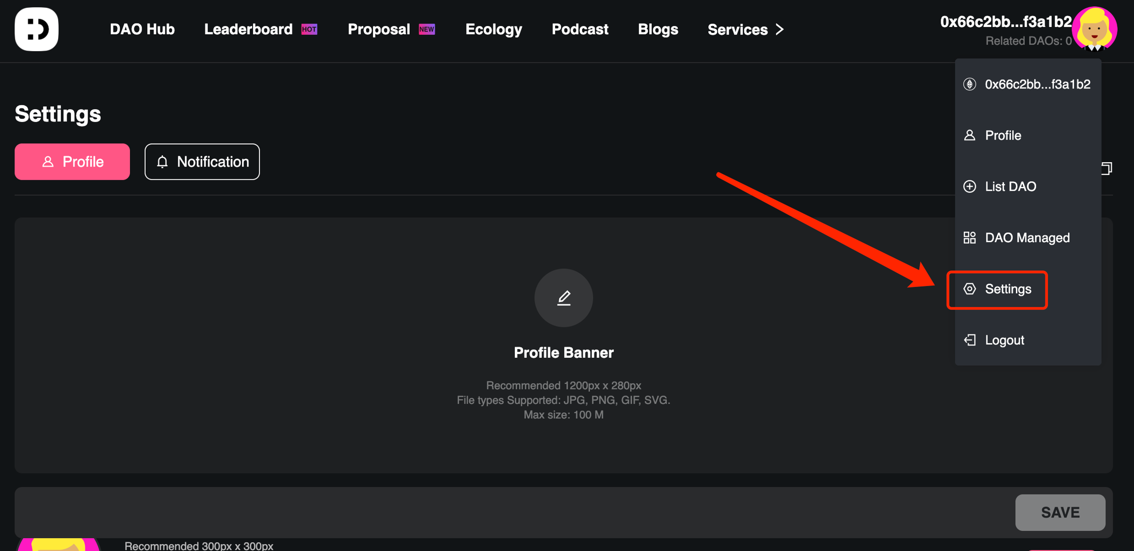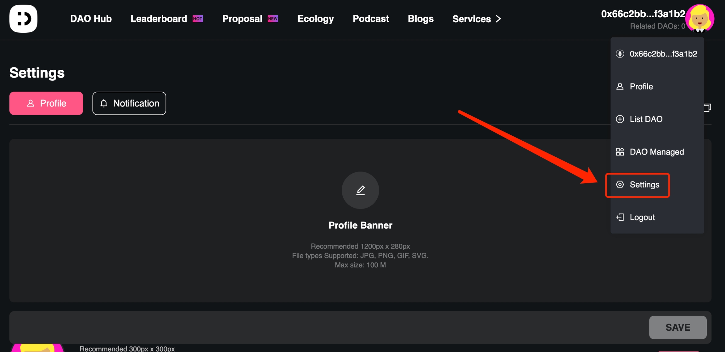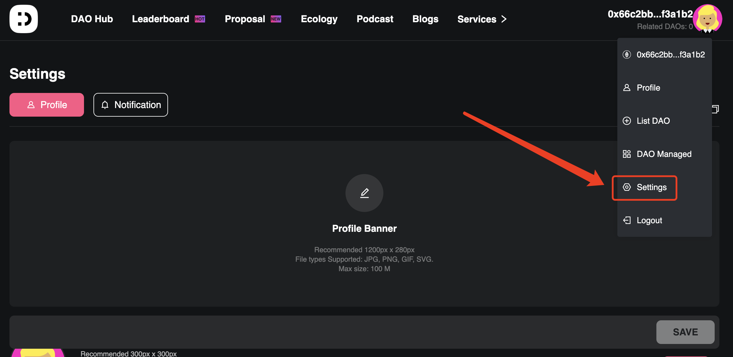1.지갑 로그인 후 프로필 설정 진입 지갑에 로그인한 후, 프로필 사진을 클릭하여 설정 페이지로 진입합니다.