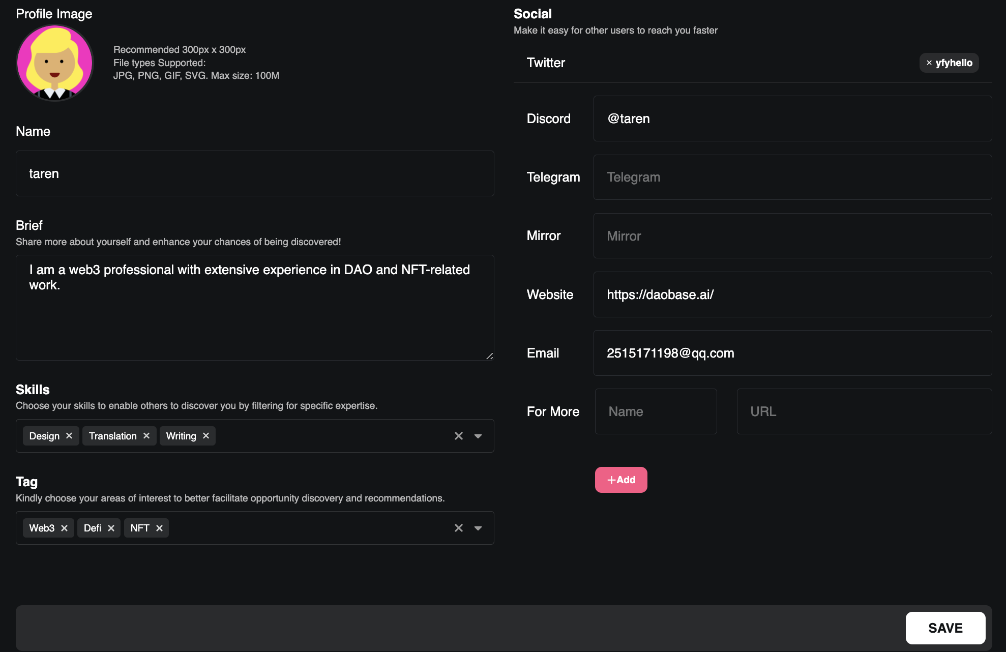 트위터 계정을 연동하여 트위터 정보를 자동으로 불러올 수 있으며, Discord, Telegram, Mirror, 웹사이트, 이메일 등 기타 SNS 정보는 수동으로 입력합니다.