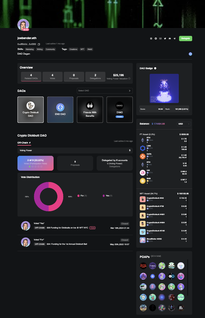 시스템은 사용자의 DAO 참여 이력을 자동으로 수집하여, 프로필 페이지에 다음과 같은 정보를 표시합니다: 참여한 DAO 목록, 투표 권한, 투표 기록, 제안 생성 이력, 위임 상태 등.
