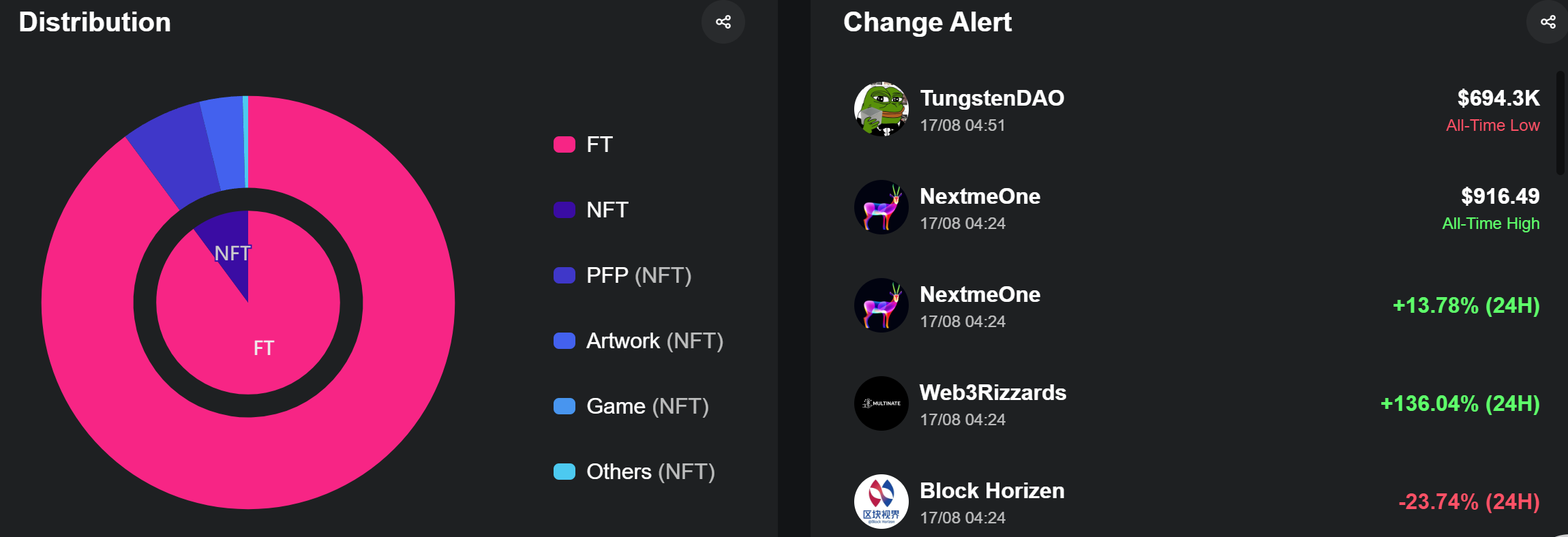 이 섹션에서는 각 DAO가 보유한 대체 가능 토큰(FT)을 보여줍니다 — 여기에는 암호화폐, 거버넌스 토큰, 유틸리티 토큰 등이 포함됩니다. 이러한 자산은 거버넌스 참여, 스테이킹, 유동성 공급, 운영 자금 등 다양한 목적으로 활용될 수 있습니다. 각 자산의 이름, 보유 수량, DAO 전체 금고 내 비중을 확인할 수 있습니다.