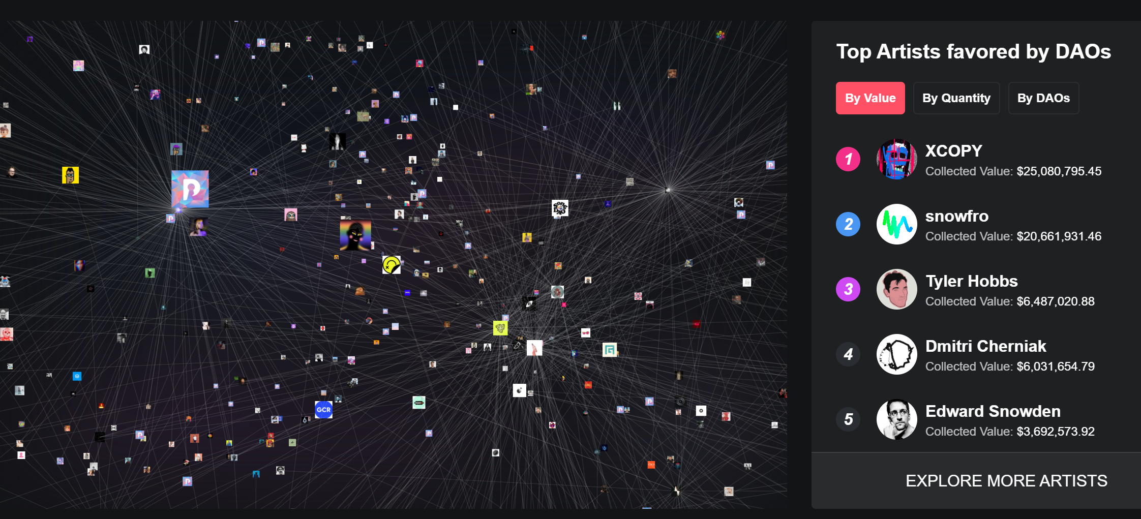 DAO가 선호하는 아티스트를 총 평가액, 수집된 작품 수, DAO 수집가 수를 기준으로 순위화합니다.