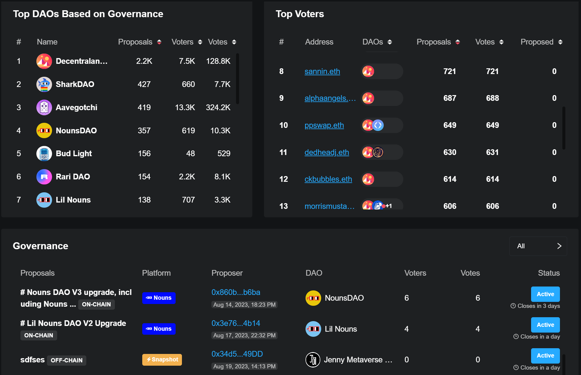 최고 거버넌스 활동 DAO 제출된 제안 수, 투표 참여율, 투표자 수 등 거버넌스 지표를 기준으로 순위가 매겨진 DAO를 확인할 수 있습니다.
