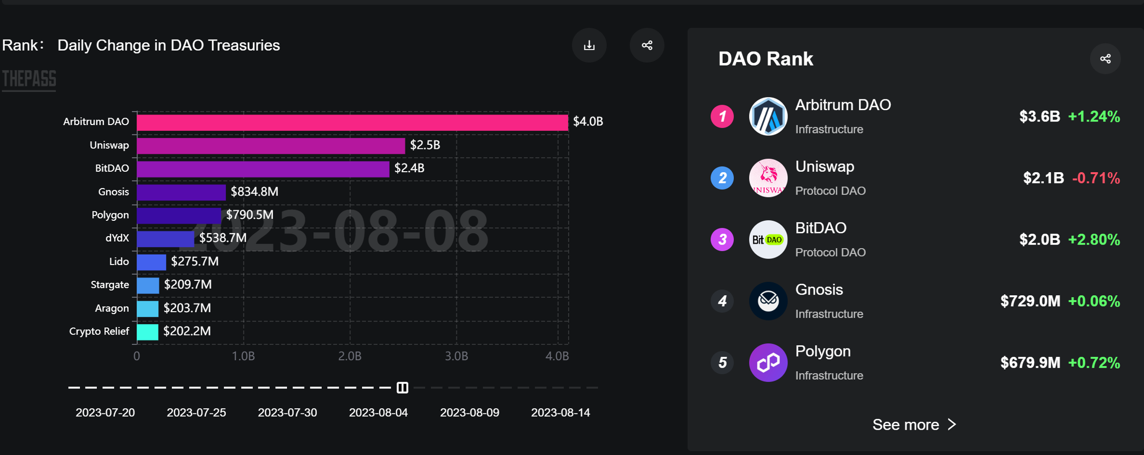 24시간 변동 랭킹: 최근 24시간 동안 금고 가치의 변동률을 기준으로 DAO를 정렬합니다. 실시간으로 높은 변동성이나 빠르게 성장 중인 DAO를 식별할 수 있습니다.