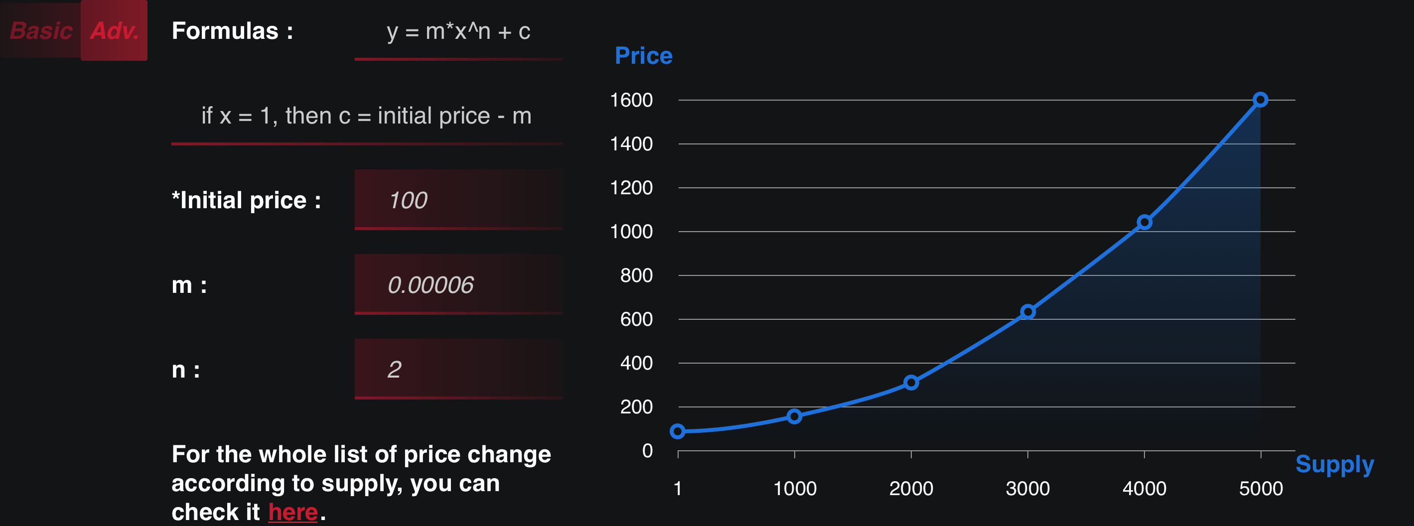기본 버전에서는 대부분 사용자들의 요구를 충족시키기 위해 m=0.00002, n=2로 고정하여, 크리에이터가 복잡한 알고리즘을 알 필요 없이 단지 판매를 시작할 초기 가격만 입력하면 되도록 설계했습니다.