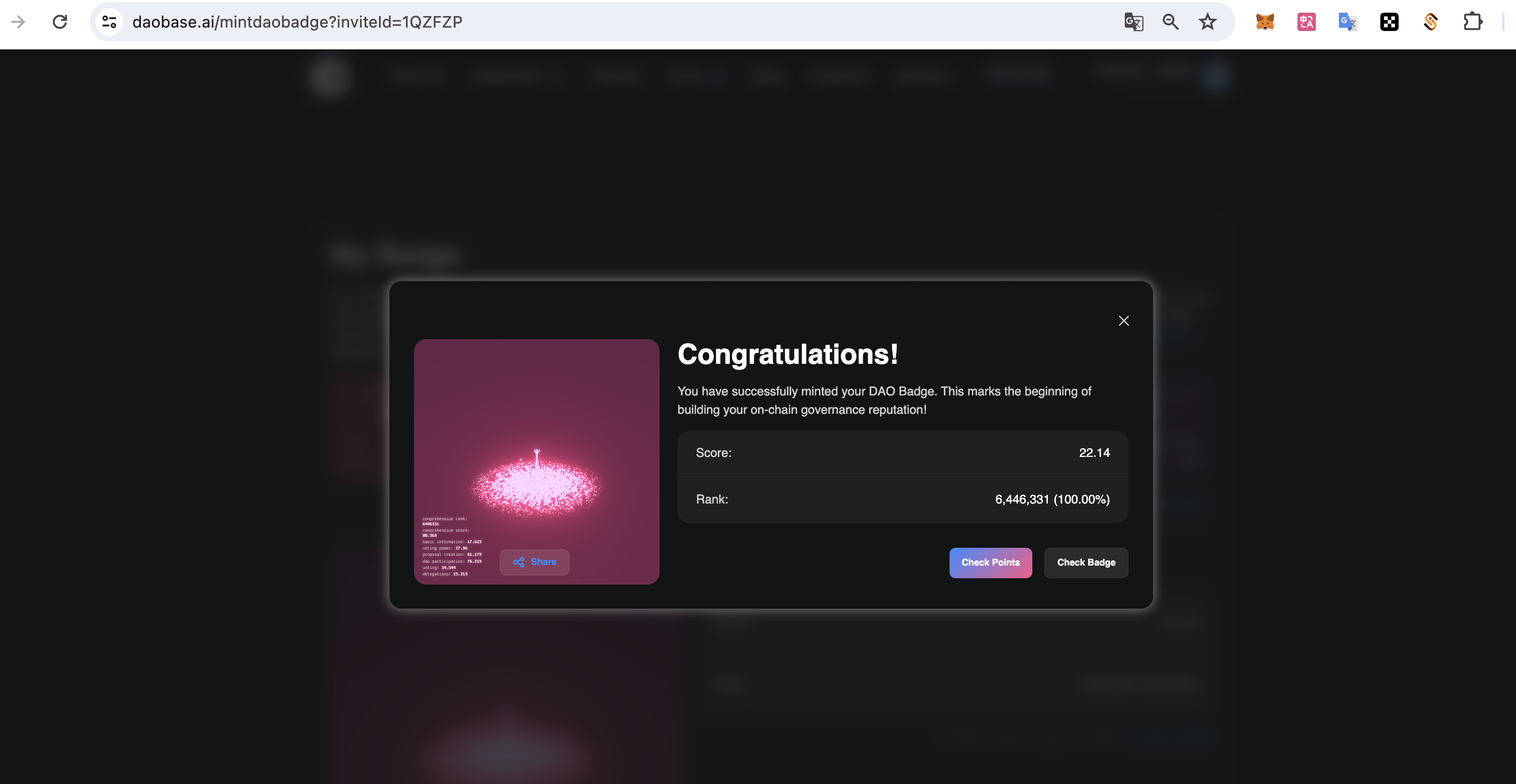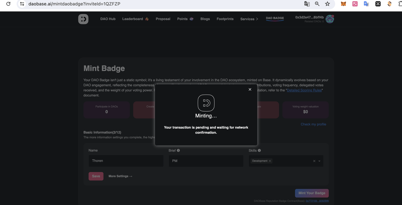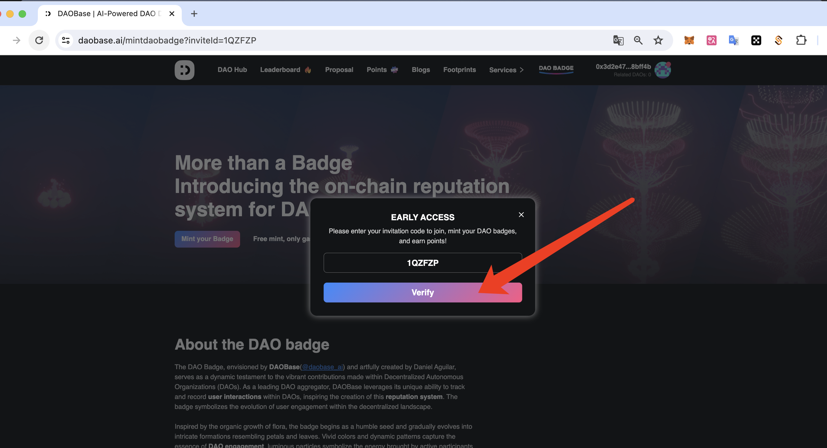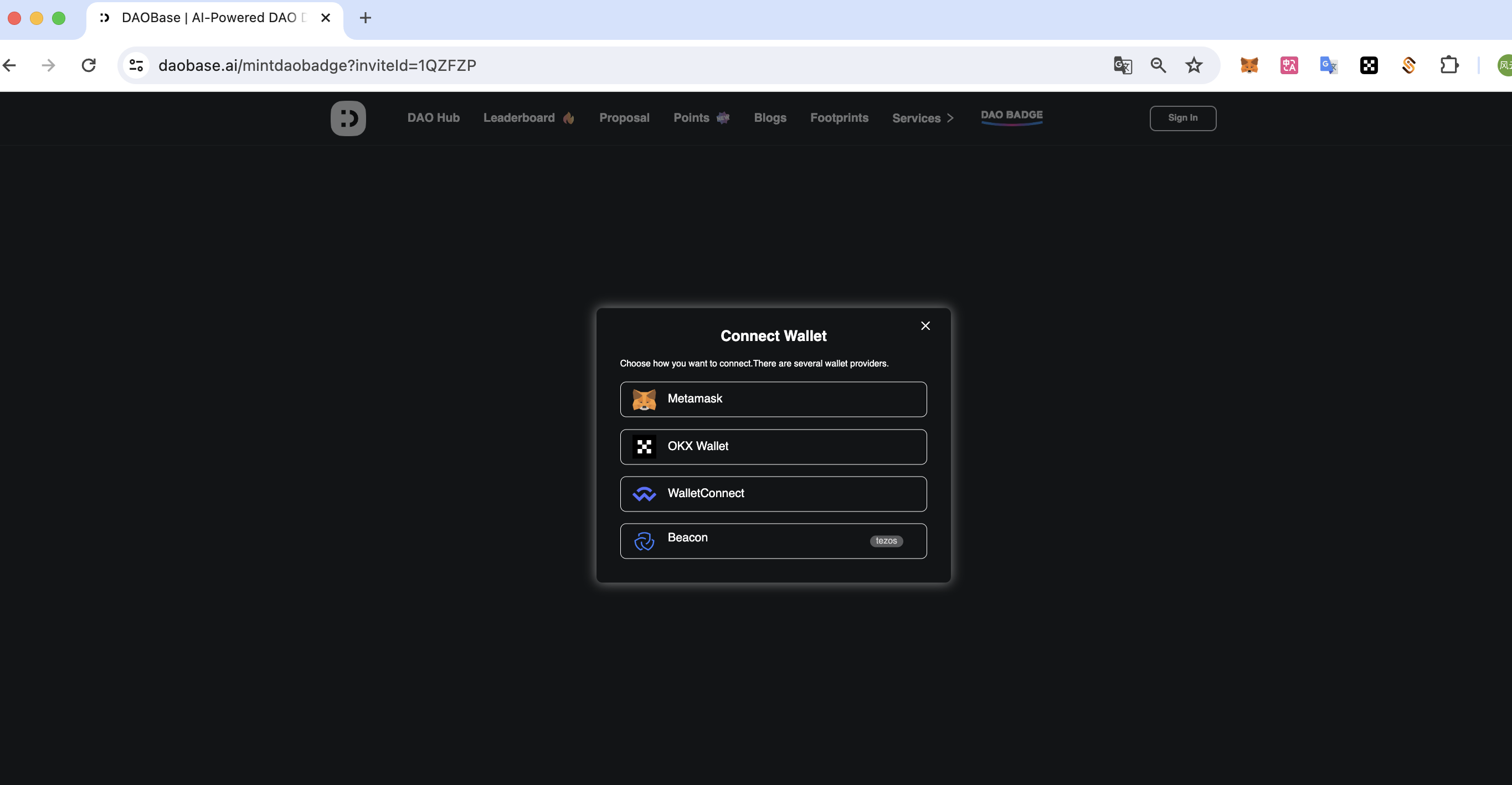 1.**Open the badge page** [**https://daobase.ai/mintdaobadge?inviteId=1QZFZP**](https://daobase.ai/mintdaobadge?inviteId=1QZFZP) **and complete the wallet connection.**